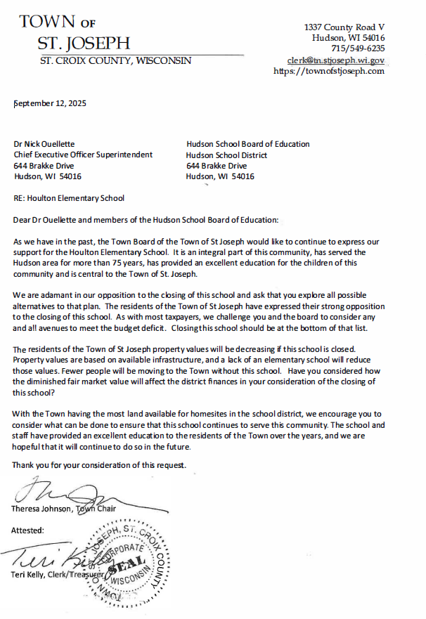 Posted on October 8, 2025, Edited October 8, 2025 by clerk Houlton Elementary School: Letter to Hudson School Superintendent and Board of Education The following letter was sent to Dr. Nick Ouellette and the Hudson School Board of Education on September 12, 2025: https://cdn.townweb.com/townofstjoseph.com/wp-content/uploads/2025/10/Ltr-re-Houlton-Elementary-School-2025-09-11-1.pdf