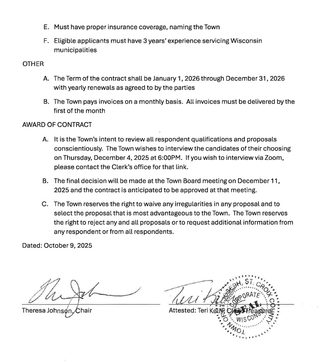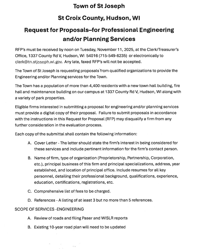 RFPs must be received by noon on Tuesday, November 11, 2025, at the Clerk/Treasurer’s Office, 1337 County Rd V, Hudson, WI 54016 (715-549-6235) or electronically to clerk@tn.stjoseph.wi.gov. Any late, faxed RFPs will not be accepted.