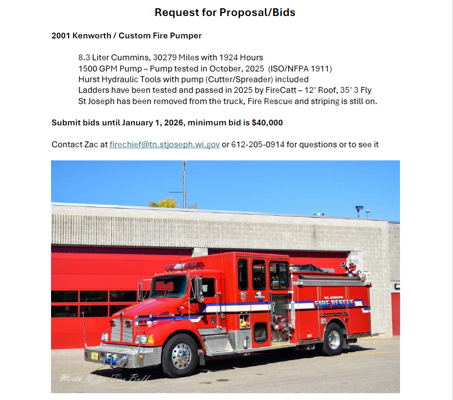 Posted on December 3, 2025, Edited December 3, 2025 by clerk Fire Department-Request for Proposal/Bids